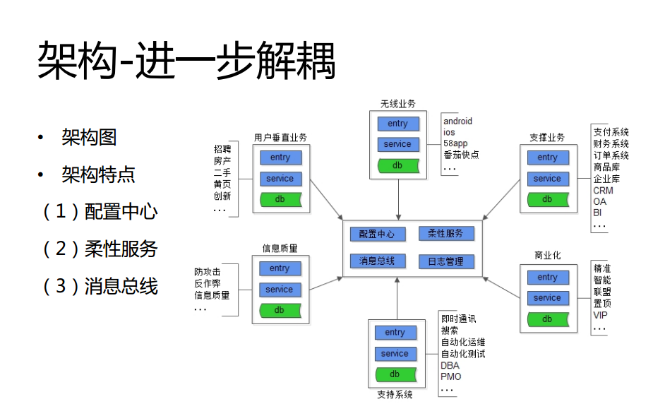 另一点就是关于数据库,当某一点成为一个业务线重点的时候,就会集中解决这个点的问题。最初期的时候每个业务线都要访问数据库,访问缓存,访问用户数据,于是把代码集中的放到了服务层。现在数据量越来越大,大家都要做数据切分,每个业务线都做切分,这个时候58同城的每个页面都面对这样的痛点,于是把这个痛点拿到集中的层面来解决。