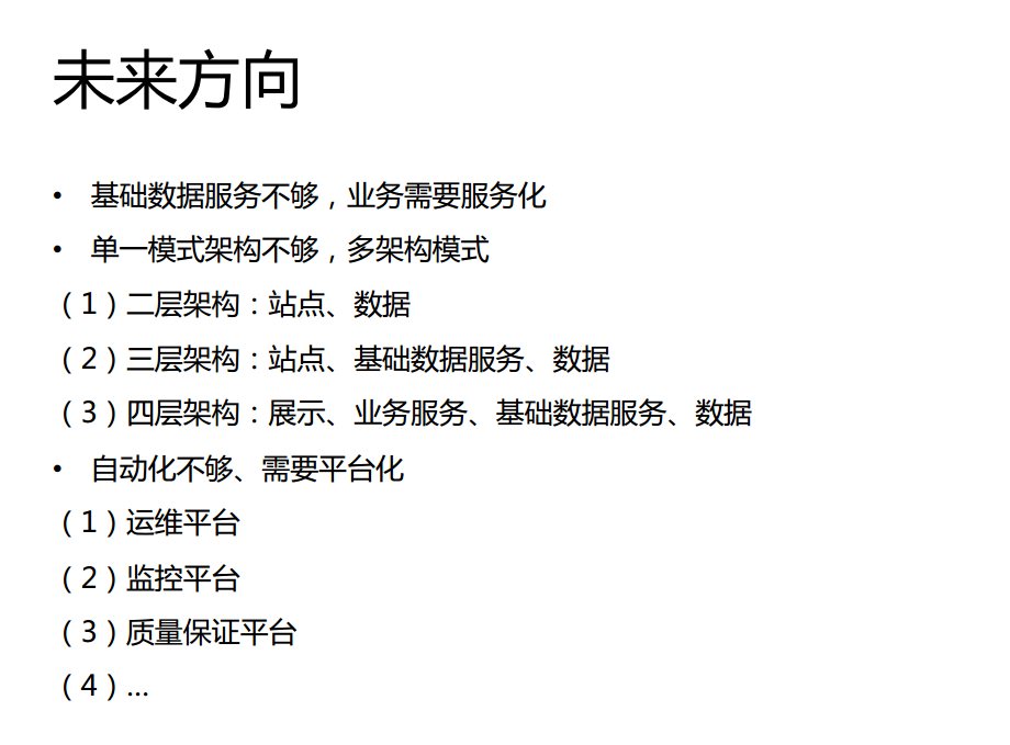 最后做一个小的总结,网站在不同的阶段遇到的问题不一样,而解决这些问题使用的技术也不一样,流量小的时候,主要目的是提高开发效率,在早期要引入ORM,DAO这些技术。随着流量变大,使用动静分离、读写分离、主从同步、垂直拆分、CDN、MVC等方式不断地提升网站稳定性。面对更大的流量时,通过垂直拆分、服务化、反向代理、开发框架(站点/服务)等等,不断提升高可用。在面对上亿级的更大流量时,通过中心化、柔性服务、消息总线、自动化(回归,测试,运维,监控)来迎接新的挑战。未来的就是继续实现