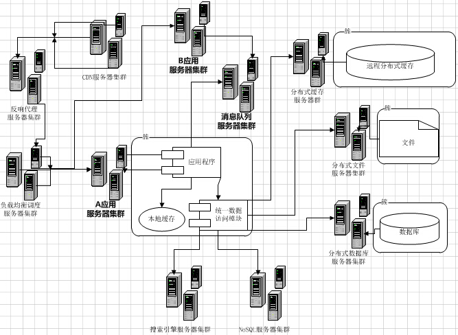 (8)使用NoSQL和搜索引擎:NoSQL和搜索引擎都是源自互联网的技术手段,对可伸缩的分布式特性具有更好的支持。应用服务器则通过一个统一数据访问模块访问各种数据,减轻应用程序管理诸多数据源的麻烦。
