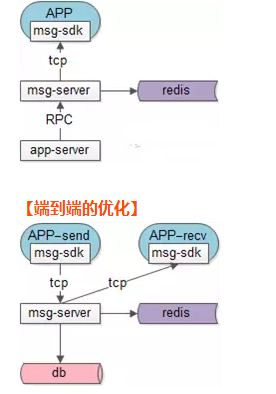 如果业务无关,则直接通过tcp通道投递;如果业务相关,发送方先来一个“端到云”的投递(通过mq),业务服务器处理再反向来一个“云到端”的投递(RPC)给接收方。