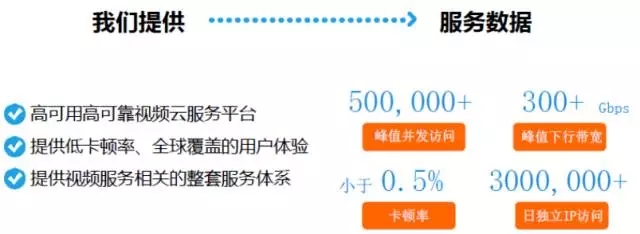 这个是我们能提供的东西,包括我们的网络分发的能力,一些带宽的数据。总结下来就是我们提供一套端到端的服务,因为做到了端到端,每个端的细节都已经考虑到了之后,我们可以做很多优化,因为端在我们手里,所以我们能做到更好的三个自适应,有了自适应就能有更好的效果,也是我们的优势。 |