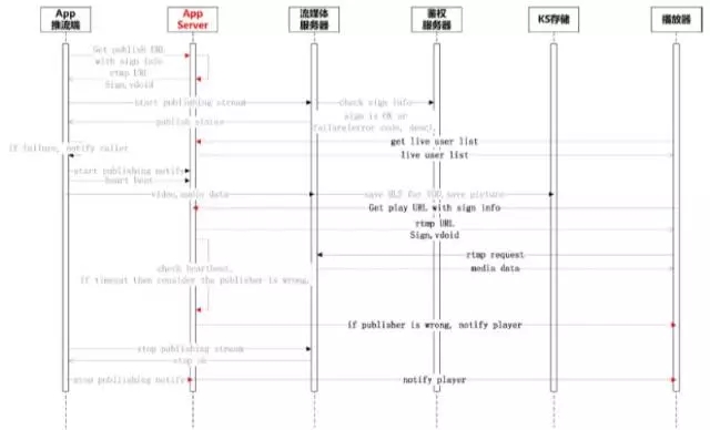 这个是介绍业务具体的流程图,这个流程图并没有什么特别,只是一般的流媒体的数据走向、各种请求。但是其中有一些坑我可以跟大家重点说一下,首先看一下直播发起流程,这肯定是由应用向自己的服务端去请求一个推流地址,这个推流地址他就用来向我们的流媒体服务器推,然后我们给它鉴权。