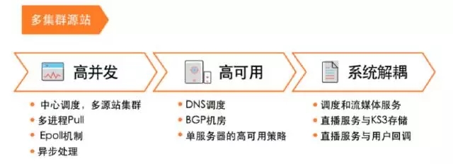 多集群源站就是刚才说到的,尽量用三线机房,或者BPG机房,然后在各个城市南北都布点,尽量的更近的触达用户,让用户推流更容易。同时我们在每个源站都部署了金山云的存储,KS3。