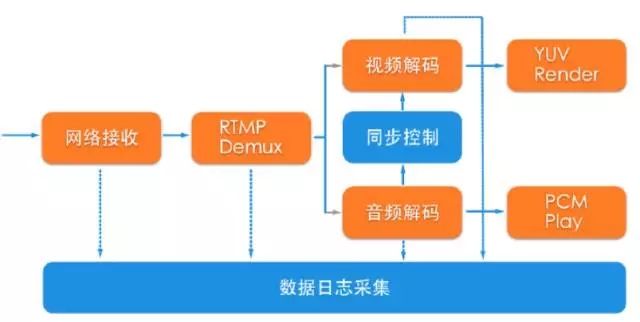 这是播放端的实现框图,中间少画了一个地方。这就是个传统的播放器框图,没有体现出我们的核心的技术点,数据从网络接收进来之后,经过RTMP的Demux之后,我们是有一个模块的,这个模块会去判断当前视频是否需要被丢弃,这个原则也和我们接收缓存有关系,我们缓存配的是两秒,如果超过两秒,或者超过某一个其他的阈值的话,我们会开启丢弃的模式。
