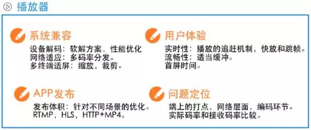 3、在播放器这边也是我们在接业务的时候,遇到用户投诉最多的,因为所有的问题都是在观看的时候体现的,所有的雷都得是播放器的同学去扛。这个需求也是不能卡,不能延迟太高。如果延迟高了,要追回来,追的时候声音不能变,最好是追的策略也能自己控制,这是用户真正提出来的需求。