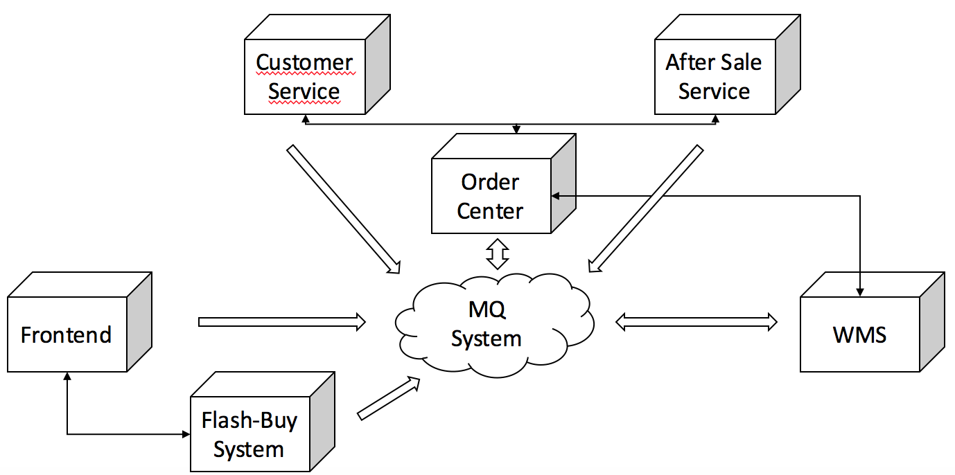 从图2可以看出,前端与后端系统完全独立出来,当前端进行抢购活动时,后端的客服、售后、物流三大服务系统不会受到任何影响。图2中所列举的子系统只是小米网中的一小部分较为主要的系统,还有很多业务没有列举出来。