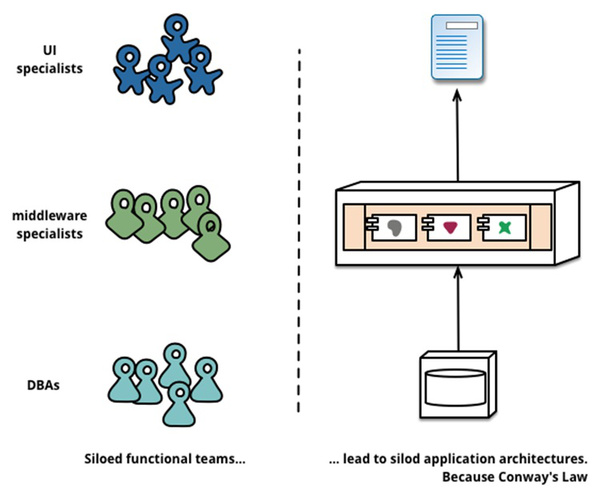 当着眼于将单一大型应用程序拆分成多个组成部分时,管理人员通常更重视技术层,其中具体包括UI团队、服务器端逻辑团队以及数据库团队。当这些团队据此进行拆分时,即使是最简单的变更也将给项目造成跨团队协作负担,并因此导致时间与预算的双重支出。睿智的团队会对此进行优化,同时采取两害相权取其轻的办法——即强制要求逻辑存在于一切与之相对接的应用程序当中。换言之,也就是实现逻辑的普遍存在性。这正是所谓康威法则[5]的一种实际表现形式。