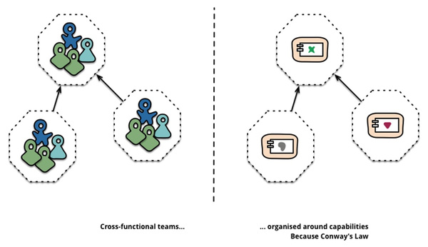 采取此类组织方式的企业实例可参见www.comparethemarket.com,其各职能团队共同负责构建并运营每款产品,而每款产品则被拆分为一系列独立的服务——且各服务间通过一套消息收发总线实现通信。