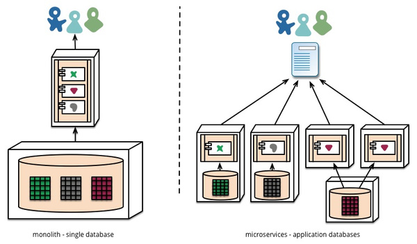 除了对概念模式进行离散化处理,微服务同时也能够拆分数据存储决策。尽管整体性应用程序倾向于使用单一逻辑数据库保存持久性数据,但企业通常更乐于利用单一数据库涵盖一系列应用程序——而且大多数此类决策立足于具体供应商提供的授权商业模式。微服务机制则选择由每项服务管理其自身数据库的方式,而非不同实例基于同一数据库技术或者完全使用多种不同数据库系统——这种方式亦被称为混合持久化。大家可以利用混合持久化方案打理整体应用程序,但其在微服务架构中的亮相频率明显更高一些。