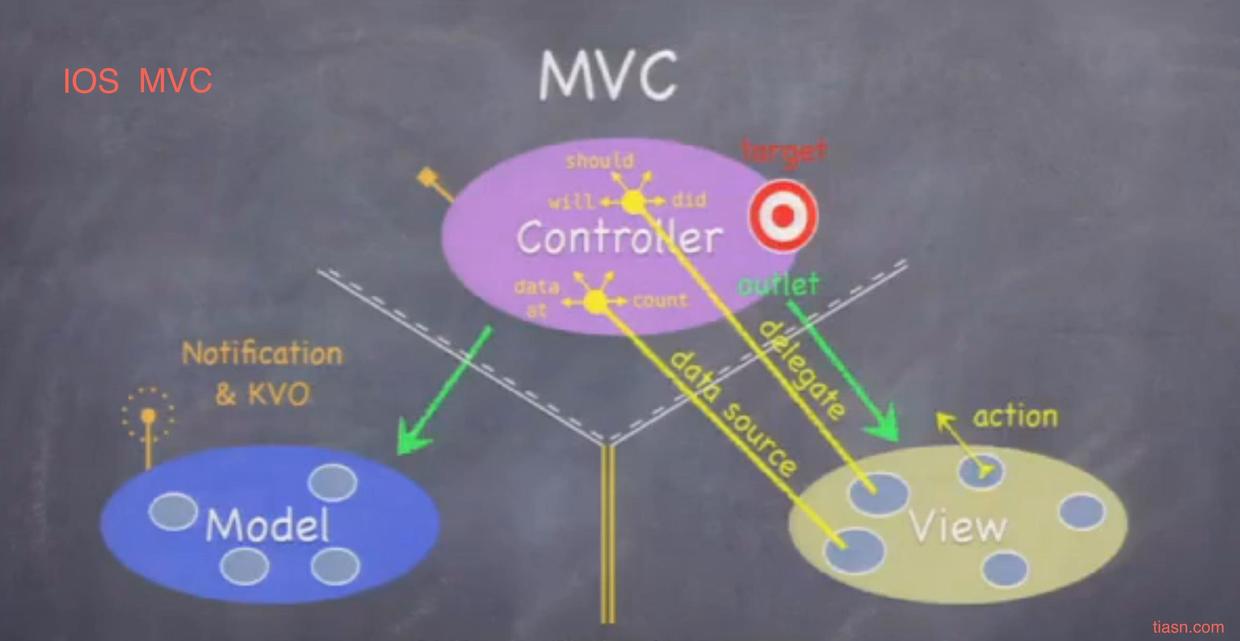 在传统的MVC结构中,数据层在发生改变之后会通知视图层进行对应的处理,视图层能直接访问数据层。但在iOS中,M和V之间禁止通信,必须由C控制器层来协调M和V之间的变化。如下图所示,C对M和V的访问是不受限的,但M和V不允许直接接触控制器层,而是由多种Callbacks方式来通知控制器