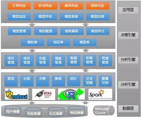 决策引擎层负责模型和规则的管理,所有系统产出的模型及规则都集合在这里进行统一管理更新。