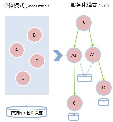 在接下来讲之前,要重点声明,本文并不是推崇服务化,不鼓励单体模式,相反而是相当肯定和支持单体模式,它模块依赖简单、一个发布包、部署于一个容器都使得构建应用非常的简单,在体量还不大的情况下,首先应该解决的是搭建好一套绝对稳定的基于模块化的平台,待体量逐渐长大,再去根据实际需要进行拆分,团队也随之变化(facebook的单体持续了非常长的时间,一是人员素质高,二就是基础平台建设的非常好)。再下个阶段体量大到饱受单体模式之苦,也应该先建设平台化服务,建设好之后,先按照大的粒度进行拆分,逐步再微服务化,否则,直接上服务化、甚至下面要说的微服务都是非常危险的,鲜有成功案例。