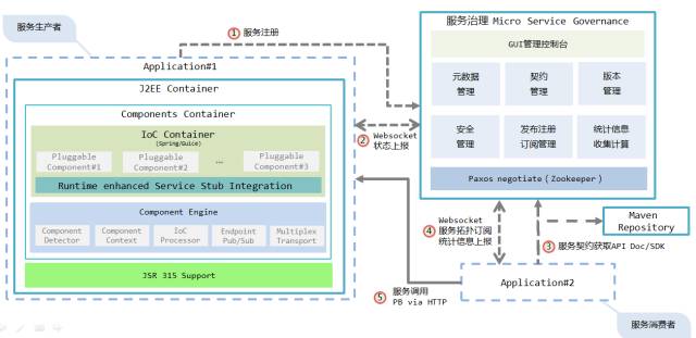在服务启动后,首先会第一步注册自己到服务治理中心,上传自己的契约、版本上去,治理中心如果通过检查就发布出去,之后和治理中心通过长连接协议(我们采用websocket,因为现成、简单)做一个订阅发布的通道,可以供收集状态,推送服务Endpint的变更;服务消费者可以去治理中心或者Maven仓库获取契约、SDK,治理中心推送Endpoint下来,供路由进行Rpc调用,通过消费者也通过长连接协议来进行状态和统计信息的上报,供治理中心进行分析决策和反馈。