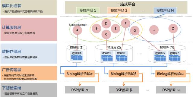 第一层,模块化组装,是各个投放产品的门面,各个投放产品可以通过搭积木式的方式,组装下层服务,就可以完成一个面向用户的功能,最常见的SpringMVC技术、Java设计模式中的facade模式就属于应用到这一层的一些点。