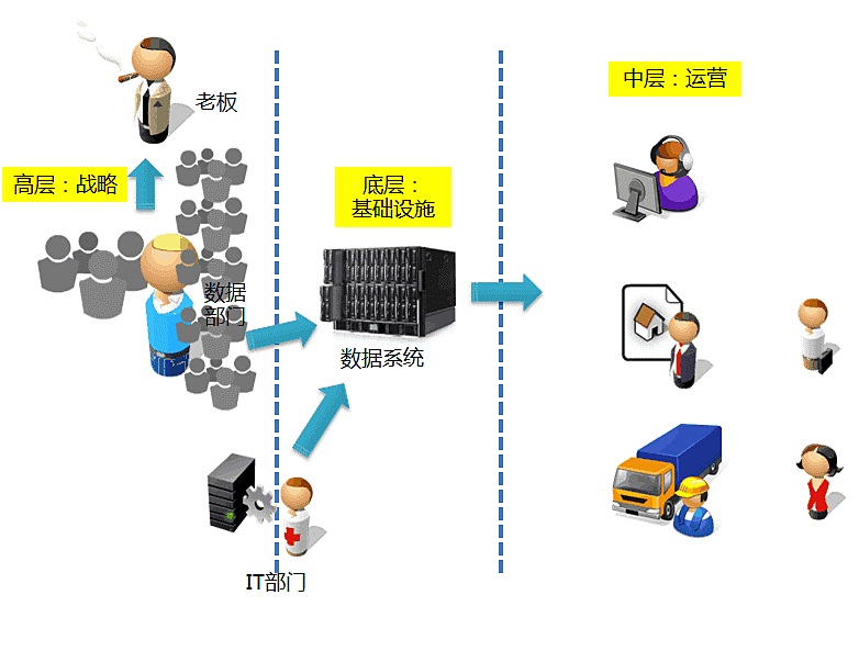 comscore... 不仅如此,每一个网站都因为要与各种市场营销第三方企业合作,而被布上了各种代码。这些代码无时无刻不在透露着这个网站相关的流量和销售信息。对他们而言,一个网站就像被X光反复扫描一样。除非你不跟他们做任何合作,否则这些数据总还是要被第三方知道,而且签署所谓的NDA协议,也不过是“防君子不防小人”。 其实,我认为,商务网站真正的数据秘密,是那些运营的细节。当然,还包括财务数据、商品的进货价格等等。但流量无秘密,用不着太紧张。 但前面说过,这是一种笨办法,如果这样规划数据部门,可能会产生一些意想不到的结果。最可能产生的结局是:数据部门会——疯掉? 这不是耸人听闻,如果数据部门要负责所有业务部门的数据,得需要多少人呢?肯定超出你的想象。此外,业务部门肯定不会仅仅只是满足于数据被提供出来,他们希望数据快些,更快些,他们希望实时数据。手工作业,实时太难,追求速度就意味着大量的人力和脑力的消耗。 好吧,就算数据部门能够提供实时数据,又能怎么样呢?数据不是策略,数据总得再经过分析和处理。数据部门不了解业务,他们能分析好吗?如果不去做这些分析,那么业务部门还得自己去分析,实时性不仅得不到保证,数据部门的价值发挥也大打折扣。 这种组织方式下,数据部门的价值和定位都很容易被质疑,而且他们还会苦逼地干得没日没夜。 如果确实是这样一种组织方式,那么对数据部门的工作定义确实要非常谨慎。数据部门应该承担提供基础数据的工作,但他们没有职责,也不应该为业务层面提供战术性的分析,他们忙不过来,也必然缺乏业务概念。但这绝对不是任何一个真正“数据驱动组织”所应该具有的定义,这是“暴殄天物”的定义。 因为这些不完美,有一种更先进一点的方式去解决上面的一些问题,并且开始被大家注意,且有被神话的趋势。 这个方式,就是BI系统。