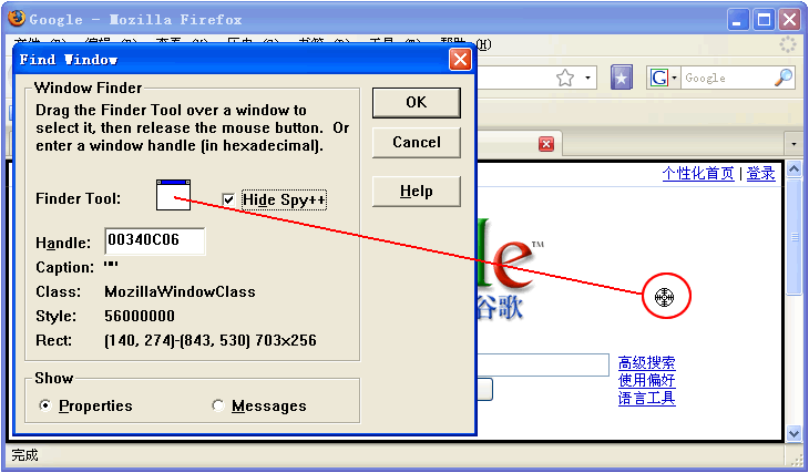 在Firefox中将google设为当前页,把刚才SPY++上的圆形小图标托拽到Firefox的google网页上,放手,点OK.