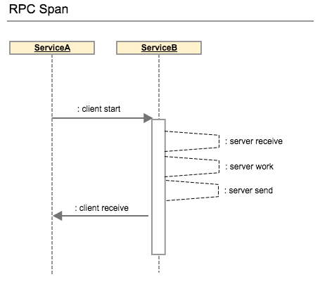 就我们的方案而言,我们选择使用Zipkin来匹配数据模型,轮流从Dapper大量借入。一个追踪树由一系列的跨度组成。跨度代表一个特殊的呼叫从服务器接收开始,到服务器发送,最后是客户端接收。举个例子,在服务器A和服务器B之间的呼叫与响应将会作为一个简单的跨度:
