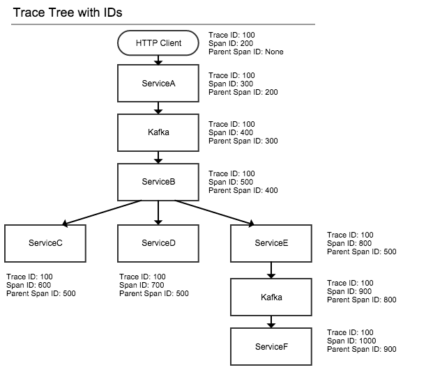 下面的图展示了在一个树结构的调用中,上面三个ID是如何应用的。注意在整个树结构中Trace ID是一致的。
