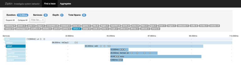 盒子外部,Zipkin在整个服务中提供一套简单的UI给视图追踪。当在所有服务中,非常容易地打印视图日志用于一个特殊的追踪ID号,Zipkin