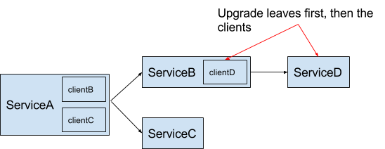 一般来说通过依赖管理工具升级依赖库相对比较容易,但如果是那些类似Thrift的RPC框架,或者一些有很深调用链的SOA框架,问题就会复杂很多。一个典型的服务通常会同时包含服务端和客户端的代码,而服务端的代码往往会依赖其他的一些客户端的依赖库。所以,升级的时候需要从服务调用树的叶子节点开始向上逐级升级,以避免服务调用的兼容性问题。因为服务提供方可能并不知道调用方是否可以检测出那些附加的追踪数据。