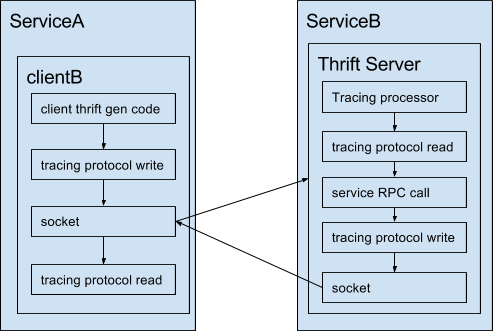 在Knewton中Thrift是服务之间使用最普遍使用的RPC框架,我们服务的大多数通过使用此框架进行通信,所以在维护后端兼容性的时候支持它,对于此项目的成功性而言有着重大的影响。更准确的说,我们想让未启用追踪的服务能与启用追踪的服务通信。