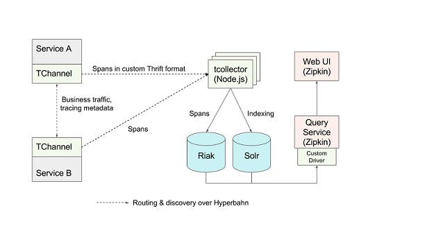 第一版客户端库依然使用TChannel发送进程外追踪Span,会将其直接提交给收集器,因此这些库需要依赖Hyperbahn进行发现和路由。对于希望在自己的服务中运用追踪能力的工程师,这种依赖性造成了不必要的摩擦,这样的摩擦存在于基础架构层面,以及需要在服务中额外包含的库等方面,进而可能导致依赖性地域。