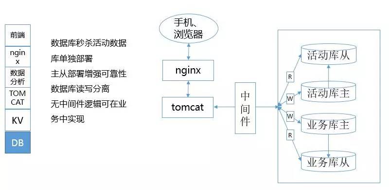 对于秒杀活动需求,可能是一系列的活动,相关逻辑可以判断是否可以做到一个专门活动库中,并进行读写分离设计。有条件的情况下,数据库中间件会完成其中一部分工作。在没有相关条件的时候,即使没有数据库中间件,相关逻辑也可以直接在代码中实现。