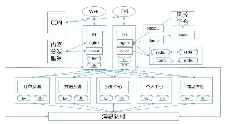 上图是优化后的微服务架构,将整个系统拆分成订单、推送、折扣、产品、个人信息等各个微服务,每个服务都有自己的数据库和缓存等,并且不会互相交叉。各服务之间使用消息队列、RPC调用等传输数据。目前大部分系统设计可能处于一站式架构和微服务架构之间,即上层应用可能已经服务化,但是数据库层面还是使用同一个库。但个人以为系统应该朝完全微服务化努力,隔离数据库层面的共用,以获得更高的系统可靠性。