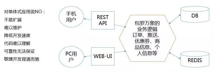 上图是一个典型的一站式架构,未经过良好的设计的系统随着时间的推移逐渐会转换成上图这样,一方面是产品业务的压力,另一方面也是先天的设计不足。一站式架构存在很多问题。