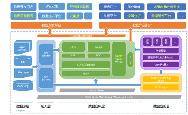 最右边的是一个数据产品门户,包括我们的用户画像、统计系统等,这里面包含大数据的很多组件,比如数据采集、数据处理、数据存储、数据挖掘等,最后产生大数据的雏形。
