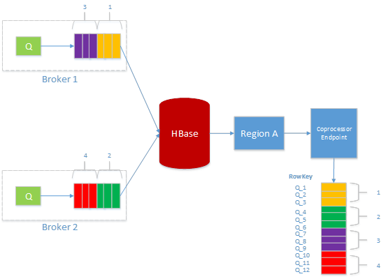 Hbase 本身不提供 queue 这个功能,但是我们可以利用 hbase 特性来实现 virtual queue 的概念,通过设计好 rowkey 来保证消息的有序性,然后将数据的读取转化为 scan 操作,下图有 4 个 client,我们为每个 client 分配一个 unique 的 queue ID,然后每个 queue 的数据通过 queue ID 和单调递增的 ID 来组合成为一个 unique 的 rowkey,为了保证写入的均匀性,我们需要合理设计 unique ID 的 prefix 来保证将这些 rowkey 均匀的分布到不同的 region。
