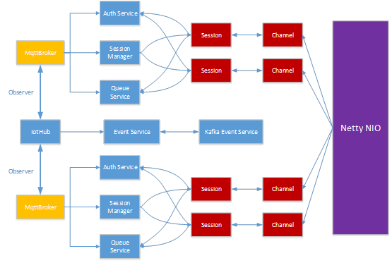 目前 MQTT 服务是一个分布式多租户的服务,一个 IotHub 上面会有很多租户的 MQTT Broker,每个 MQTT broker 对应一个 tenant,每个 broker 有自己的 authentication service, session manager, Queue service,以及很多其他服务,包括 unique Id generator,backend storage service,以及 router 服务,当一个 client 的通过 TCP 和我们的服务建立连接之后,首先我们会为该 client 创建一个 session,这个 session 会检查该 client 是否合法,包括 tenant 名字,用户名,密码,如果所有的都合法的话,我们会把这个 client 的 session 添加到 session manager,如果不是合法的,我们会直接把这个 client 的连接给断开。