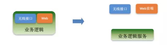 那么如何实现有效隔离呢?首先两者共享核心的业务逻辑,所以核心业务逻辑要独立出来,以一致的方式供APP和web调用;同时,无线接口服务于APP,和web前端没有任何关系,需要进一步对它们进行剥离,单独维护和部署,经过拆分后架构如图二所示。