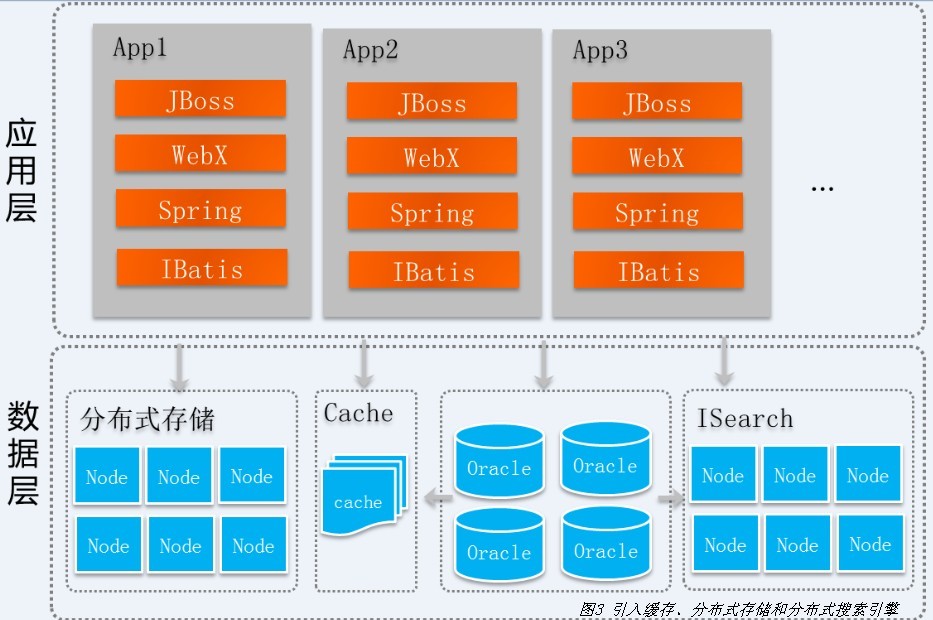 2007年,淘宝全年的交易额超过400亿元,平均近1亿多一天,每天有100多万笔交易被创建。当时面对的几个主要问题是:一些系统的流量非常大,如商品详情等,如果直接访问数据库,会导致数据库压力非常大;如用户信息,访问一个页面,都需要查询买家信息、卖家信息、显示出买家的信用、卖家的服务星级等。此时,淘宝采用分布式缓存TDBM(Tair的前身)将这些热点静态数据缓存在内存中,提高访问性能。另外,将自己研发的分布式文件系统TFS部署在多台x86服务器上,取代商业的NAS存储设备来存储淘宝的各种文件信息,如商品图片、商品描述信息、交易快照信息,来达到降低成本和提高整体系统的容量和性能的目的,同时可以实现更灵活的扩展性。第一期上线大概200台TFS服务器。另外,将ISearch搜索引擎改为分布式架构,支持水平扩展,部署了48个节点。图3展示了这一架构思路。