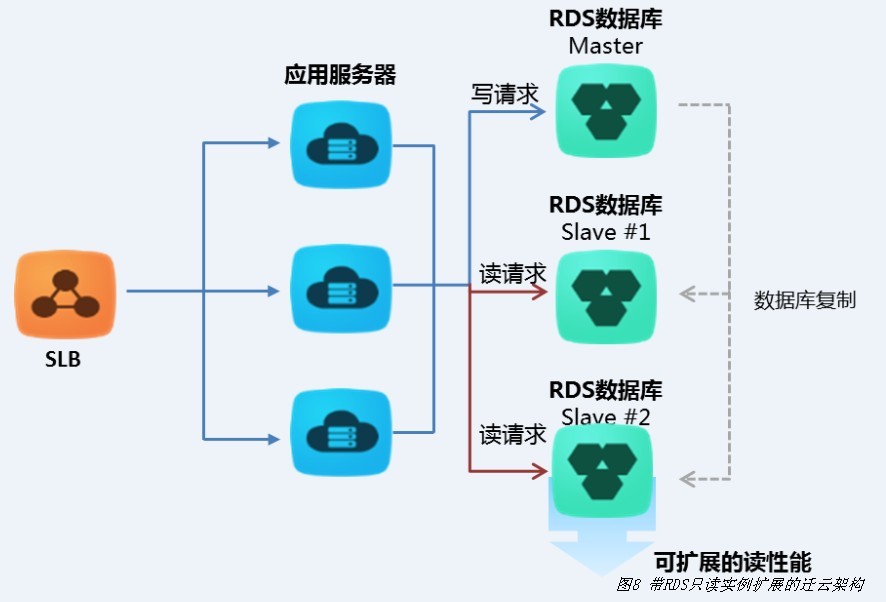 对于读的请求远大于写请求的场景,可以考虑用多个RDS数据库,采用分布式方式实现读写分离,写交易主要发生在主库,读请求访问备库,可以根据需求对读库进行扩展,以实现整体请求性能的提升。图8是带只读实例扩展的迁云架构。