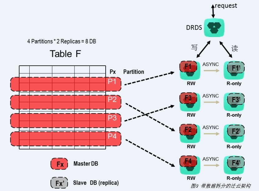 对于数据规模较大的数据库表,可以通过水平切分的方式,将数据分布在多个RDS实例上,通过并行的分布式数据库操作来实现性能和容量的提升。图9是带数据拆分的迁云架构。