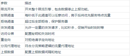 其次将限流引擎中的参数进行整理,对外提供HTTP Rest接口,可以热更新限流策略和相关参数,对接应用限流-配置中心子系统。值得注意的是,openresty提供了一种dict的类型是子进程内存共享的,可以跨worker访问,如果操作是进程不安全操作记得加锁,另外这种类型在声明时需要提供开辟内存大小,根据业务负载情况进行指定,超过内存大小会通过LRU算法进行内存回收。以下介绍了一些重要参数的说明: