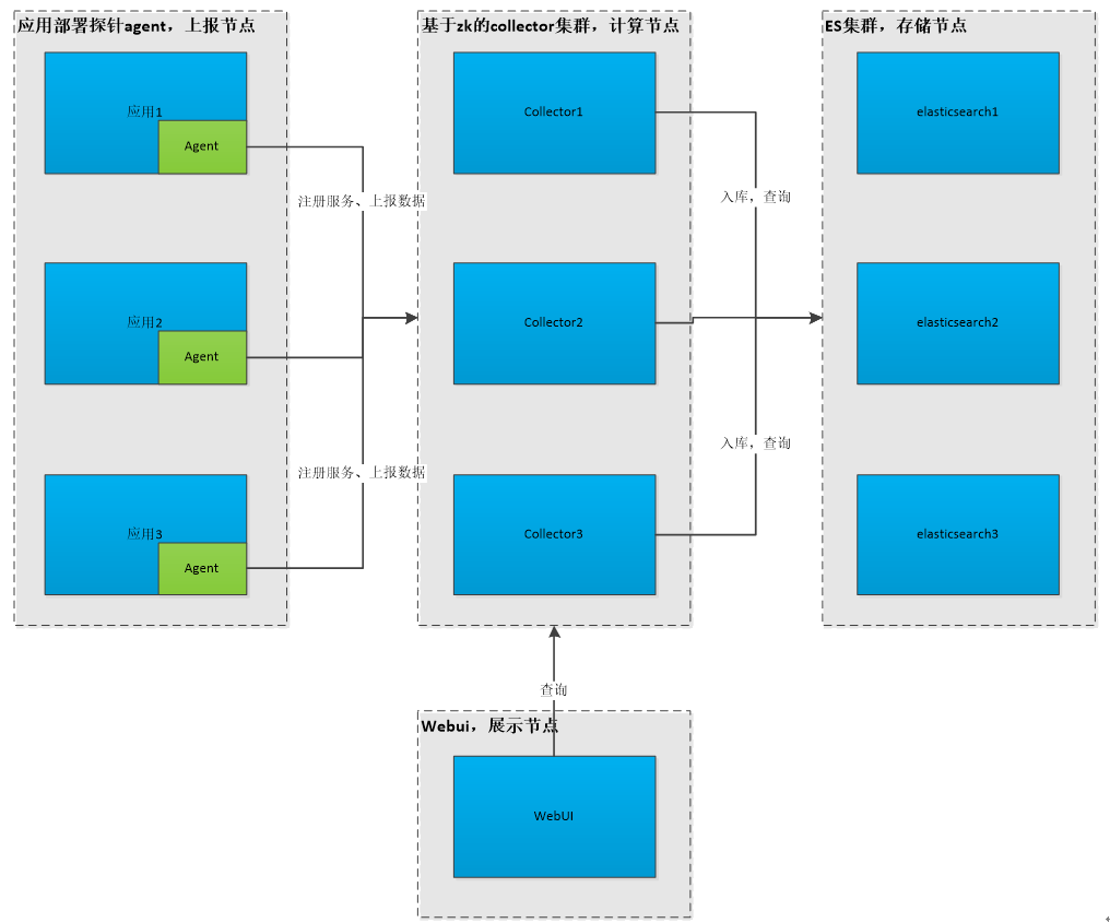 最终我们选取了OpenSkywalking团队开发的skywalking产品(http://skywalking.io)作为当当APM系统,并进行定制开发。Skywalking是遵守opentracing规范(CNCF基金会下,开源分布式服务追踪标准)开发的,针对java支持使用字节码增强技术,无需改动代码即可实现系统追踪。自动追踪支持主流的web容器、中间件、RPC组件、数据库和NOSQL等。架构图如下: