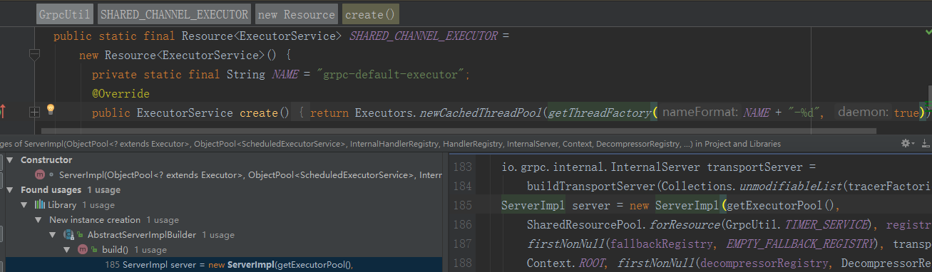 其中,Executor默认使用的是JDK的CachedThreadPool,在构建ServerImpl的时候进行初始化,代码如下: