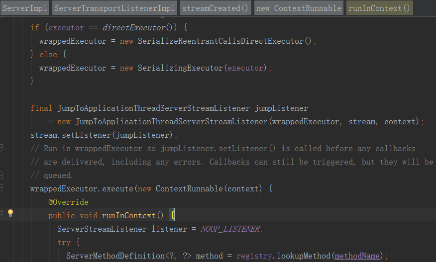 当服务端接收到客户端HTTP/2请求消息时,由Netty的NioEventLoop线程切换到gRPC的SerializingExecutor,进行消息的反序列化、以及服务接口的调用,代码示例如下: