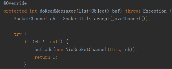 步骤3:如果监听到客户端连接,则创建客户端SocketChannel连接,从workerGroup中随机选择一个NioEventLoop线程,将SocketChannel注册到该线程持有的Selector,代码示例如下: