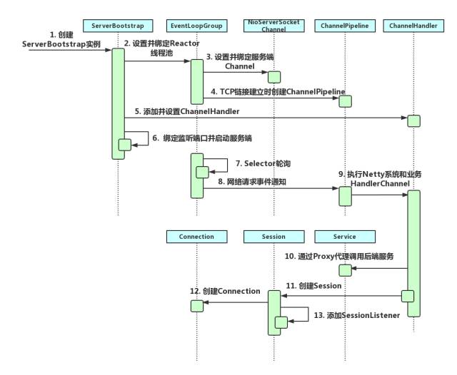 其中步骤一至步骤九是 Netty 服务端的创建时序,步骤十至步骤十三是 TCP 网关容器创建的时序。