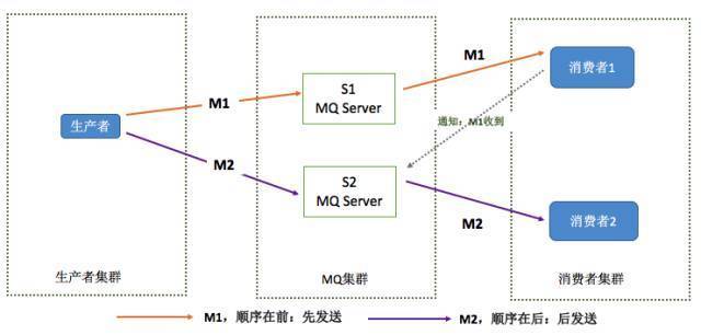 M1发送到S1后,M2发送到S2,如果要保证M1先于M2被消费,那么需要M1到达消费端后,通知S2,然后S2再将M2发送到消费端。