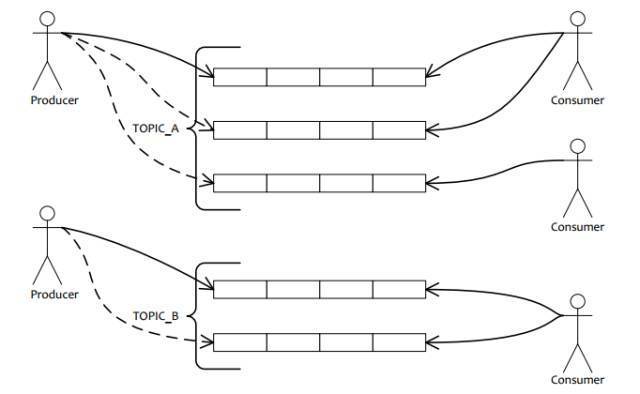 Producer向一些队列轮流发送消息,队列集合称为Topic,Consumer如果做广播消费,则一个consumer实例消费这个Topic对应的所有队列;如果做集群消费,则多个Consumer实例平均消费这个Topic对应的队列集合。