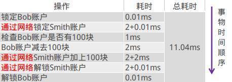 当用户增长到一定程度,Bob和Smith的账户及余额信息已经不在同一台服务器上了,那么上面的流程就变成了这样: