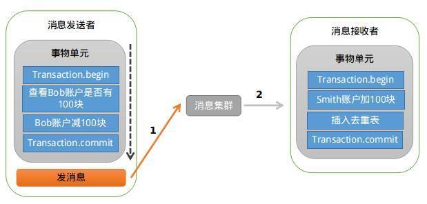 存在的问题跟上面类似:如果扣款成功,发送消息失败,就会出现Bob扣钱了,但是Smith账户未加钱。