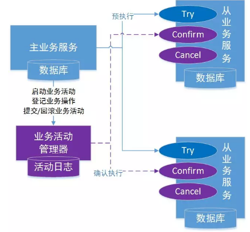 XA 等传统模型,其特征在于它不依赖资源管理器(RM)对分布式事务的支持,而是通过对业务逻辑的分解来实现分布式事务。
