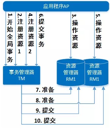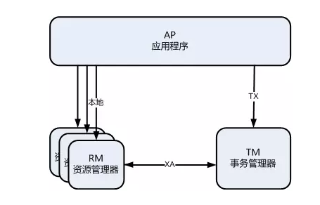 Manager)和多个资源管理器(RM,Resource Manager)。全局事务管理器负责管理全局事务状态与参与的资源,协同资源一起提交或回滚;资源管理器则负责具体的资源操作。