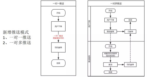 一对多的推送,省去了推送的算法,用户选择多个司机,然后我们的系统根据用户筛选的司机,挑选出在线的列表,然后全部推送给那些司机,直到司机又抢单就结束了。