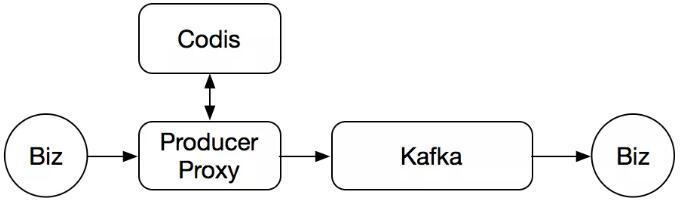 首先需要解决业务方消息生产失败的问题。因为这个Kafka用的是发布/订阅模式,一个topic的订阅方会有很多,涉及到的下游业务也就非常多,没办法一口气直接替换Kafka,迁移到新的一个消息队列服务上。所以我们当时的方案是加了一层代理,然后利用codis作为缓存,解决了Kafka不定期写入失败的问题,如上图。当后面的Kafka出现不可写入的时候,我们就会先把数据写入到codis中,然后延时进行重试,直到写成功为止。